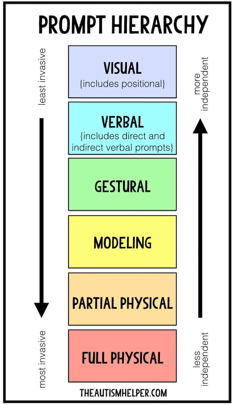 There are different types of prompts that fall into a hierarchy or order. Understanding this order will also help to eventually fade these prompts as a skill is learned and mastered. At the bottom of the hierarchy are the most intrusive and least amount of independence prompts. As we move up the list, the prompts become less invasive and the person’s independence increases.